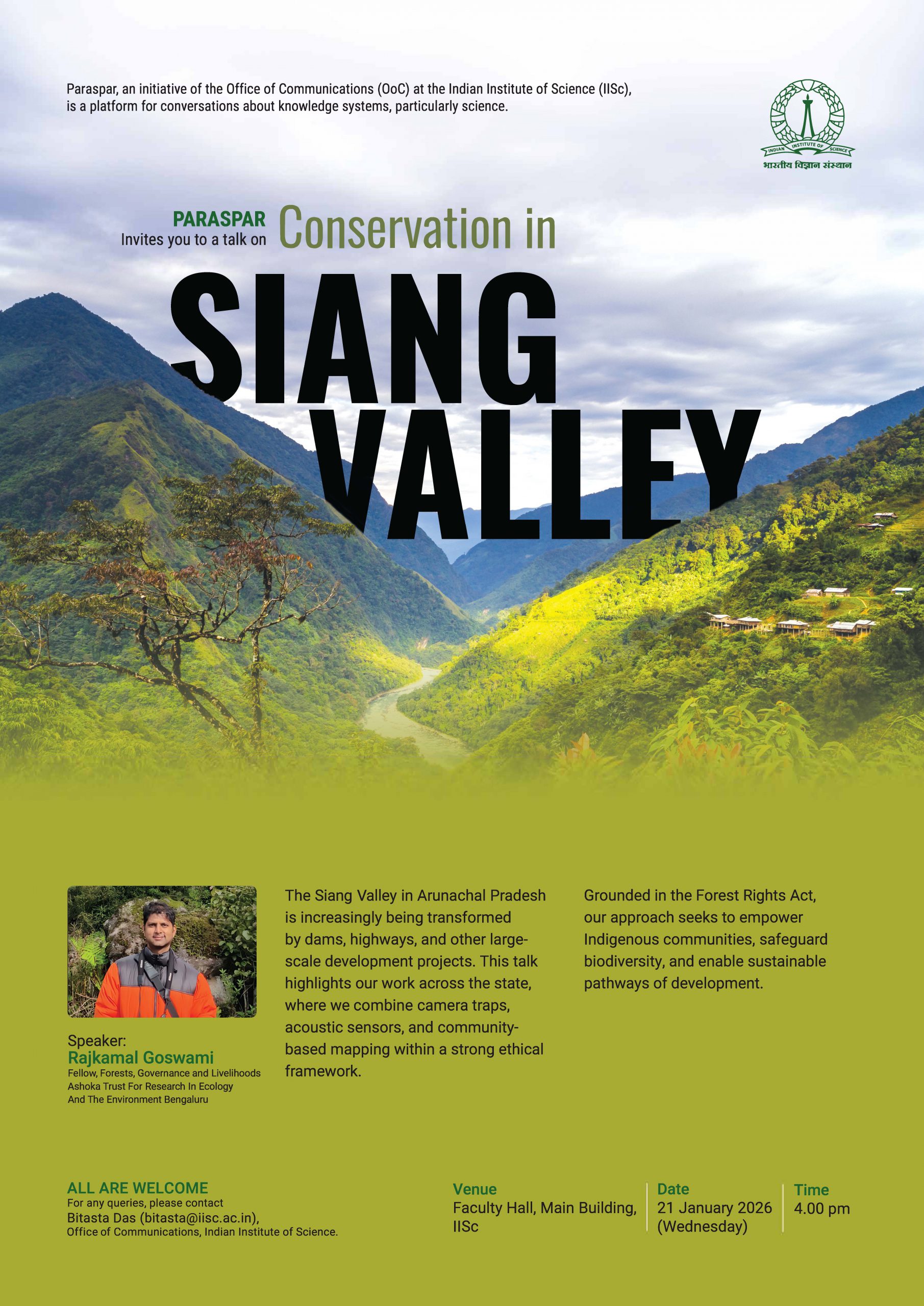 Abstract: The Siang Valley in Arunachal Pradesh is increasingly being transformed by dams, highways, and other large-scale development projects. This talk highlights our work across the state, where we combine camera traps, acoustic sensors, and community-based mapping within a strong ethical framework. Grounded in the Forest Rights Act, our approach seeks to empower Indigenous communities, safeguard biodiversity, and enable sustainable pathways of development.
