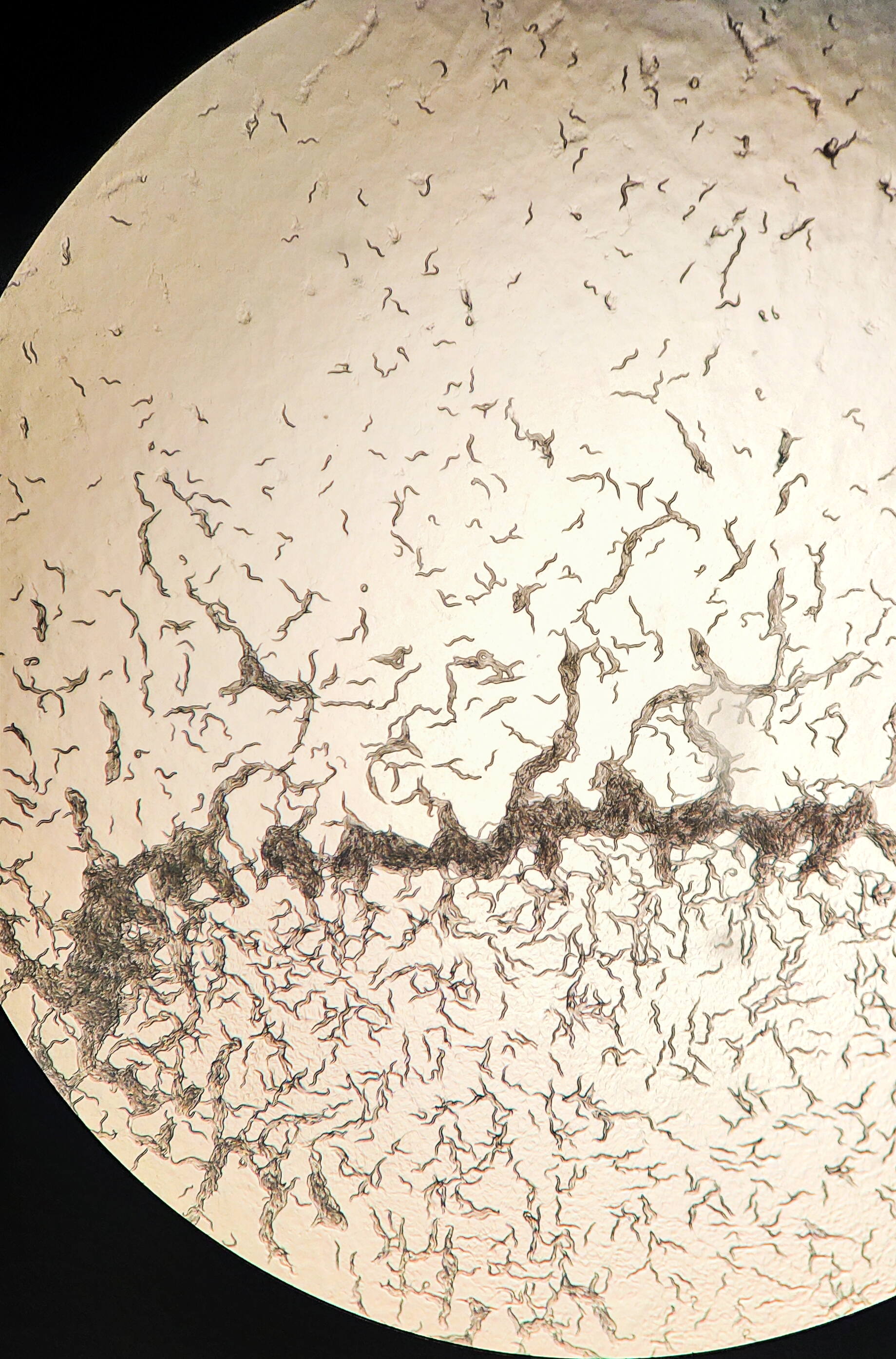 Swarm formation in casy-1 mutant worms, demonstrating aggregate feeding and coordinated movement across the food lawn boundary (Image: Navneet Shahi)