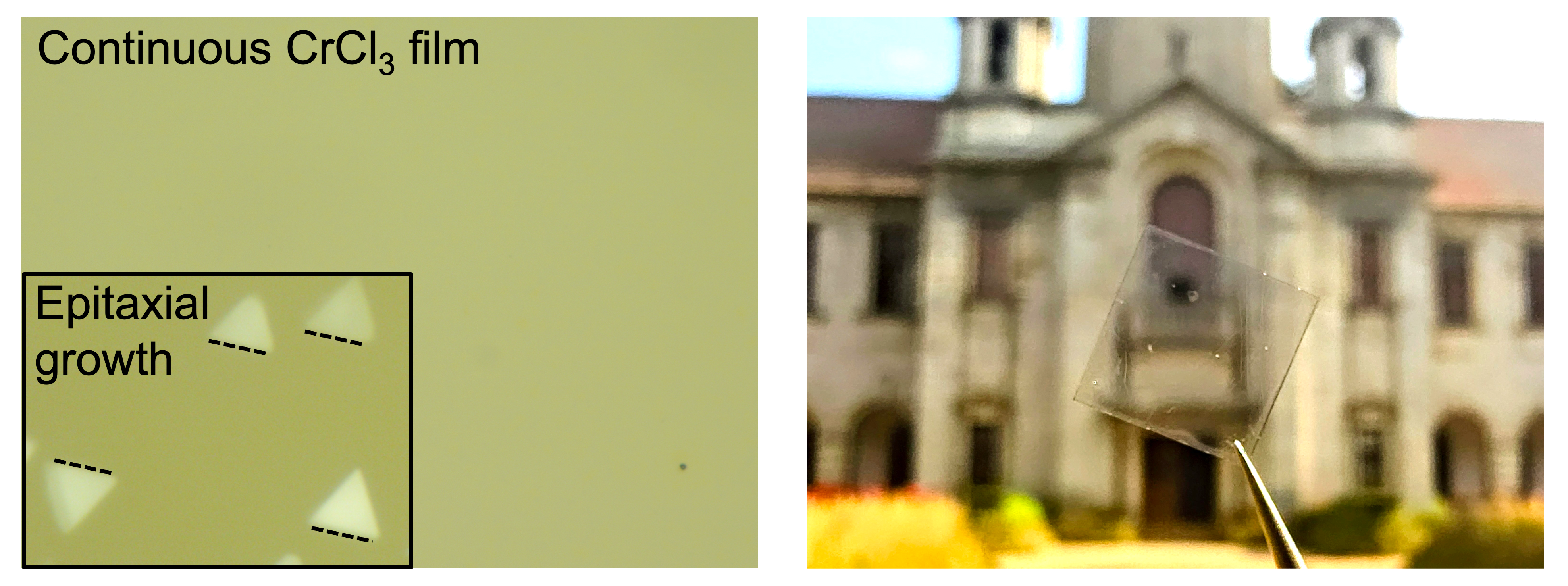 Left: Wafer-scale continuous CrCl₃ film (inset: epitaxial growth). Right: As-grown film on mica in front of IISc main building (Image: Vivek Kumar)