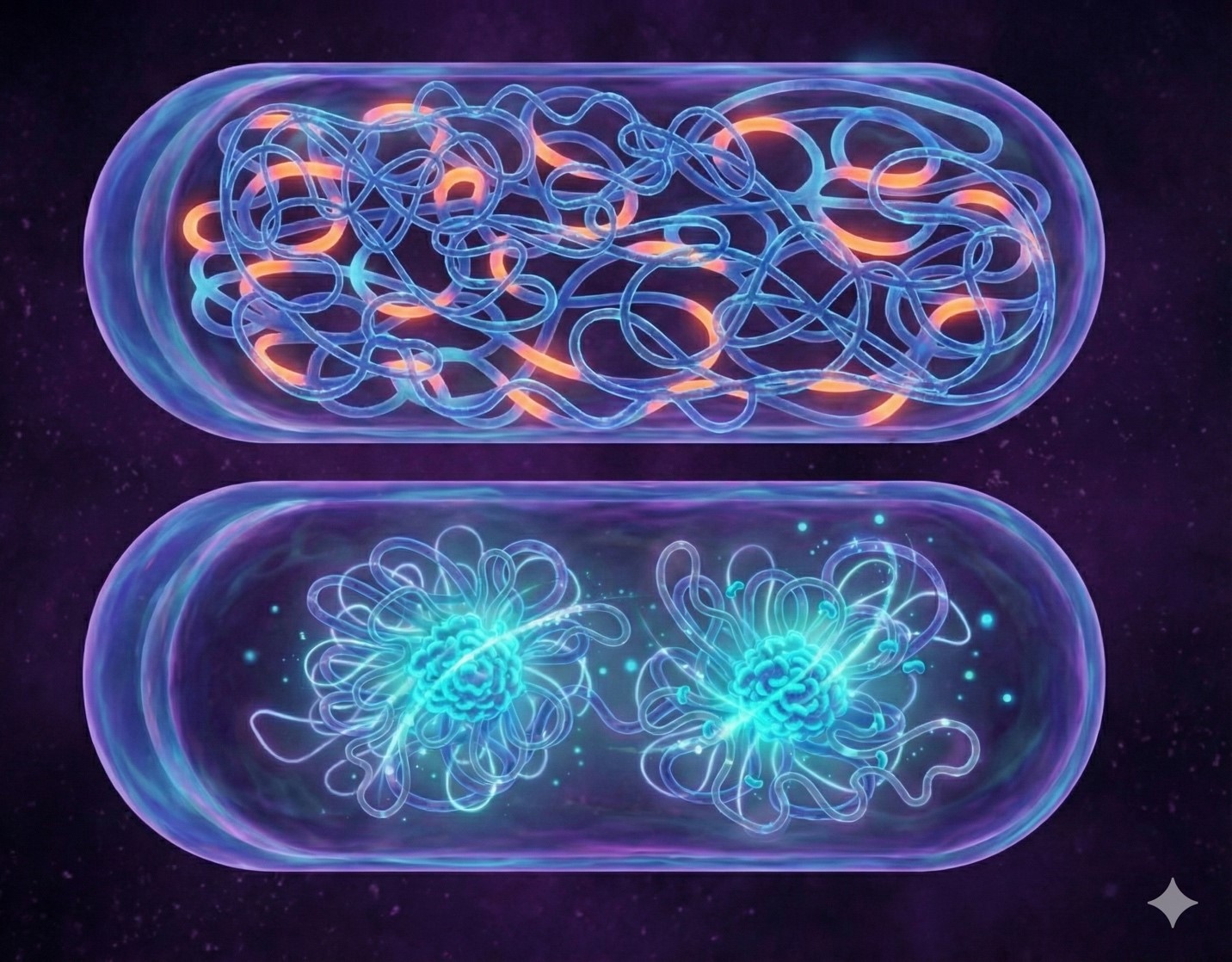 Representative cartoon illustrating genome organisation in an M. tuberculosis cell in the absence (top) and presence (bottom) of Lsr2. In the absence of Lsr2, DNA is poorly organised within the cell, with AT-rich regions highlighted in orange. Lsr2 proteins recognise and selectively bind these regions to form DNA-Lsr2 co-condensates, leading to a higher order genome organisation and effectively regulating gene expression (Image: Thejas Satheesh, created with assistance from Google Gemini)