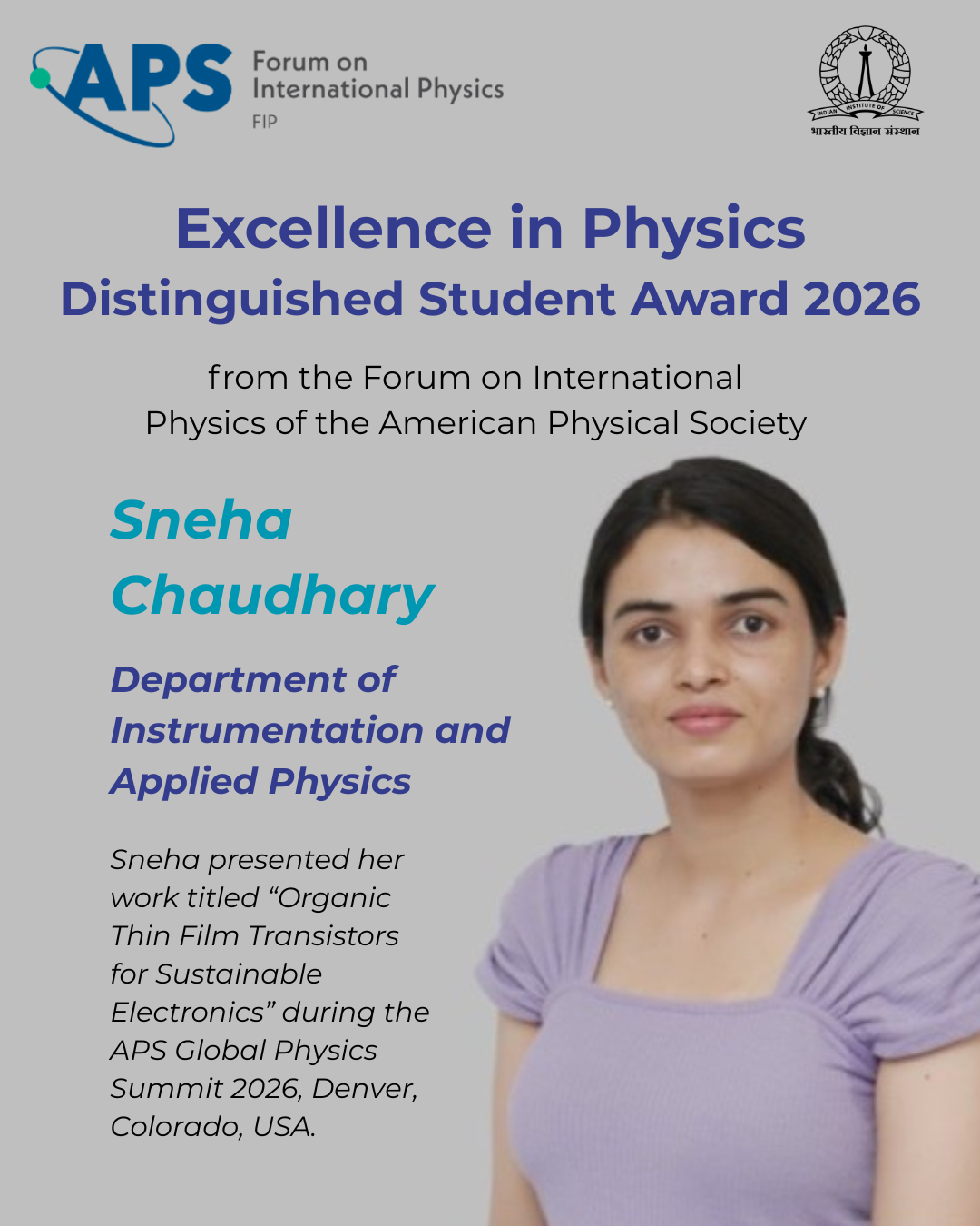 The award was formally presented at the Forum on International Physics reception during the APS Global Physics Summit 2026, Denver, Colorado, USA. At the conference, Sneha presented her work titled “Organic Thin Film Transistors for Sustainable Electronics.” Her research demonstrates the modeling, design and fabrication of organic thin-film transistors (OTFTs) on biodegradable cellulose acetate substrates while maintaining strong device performance.