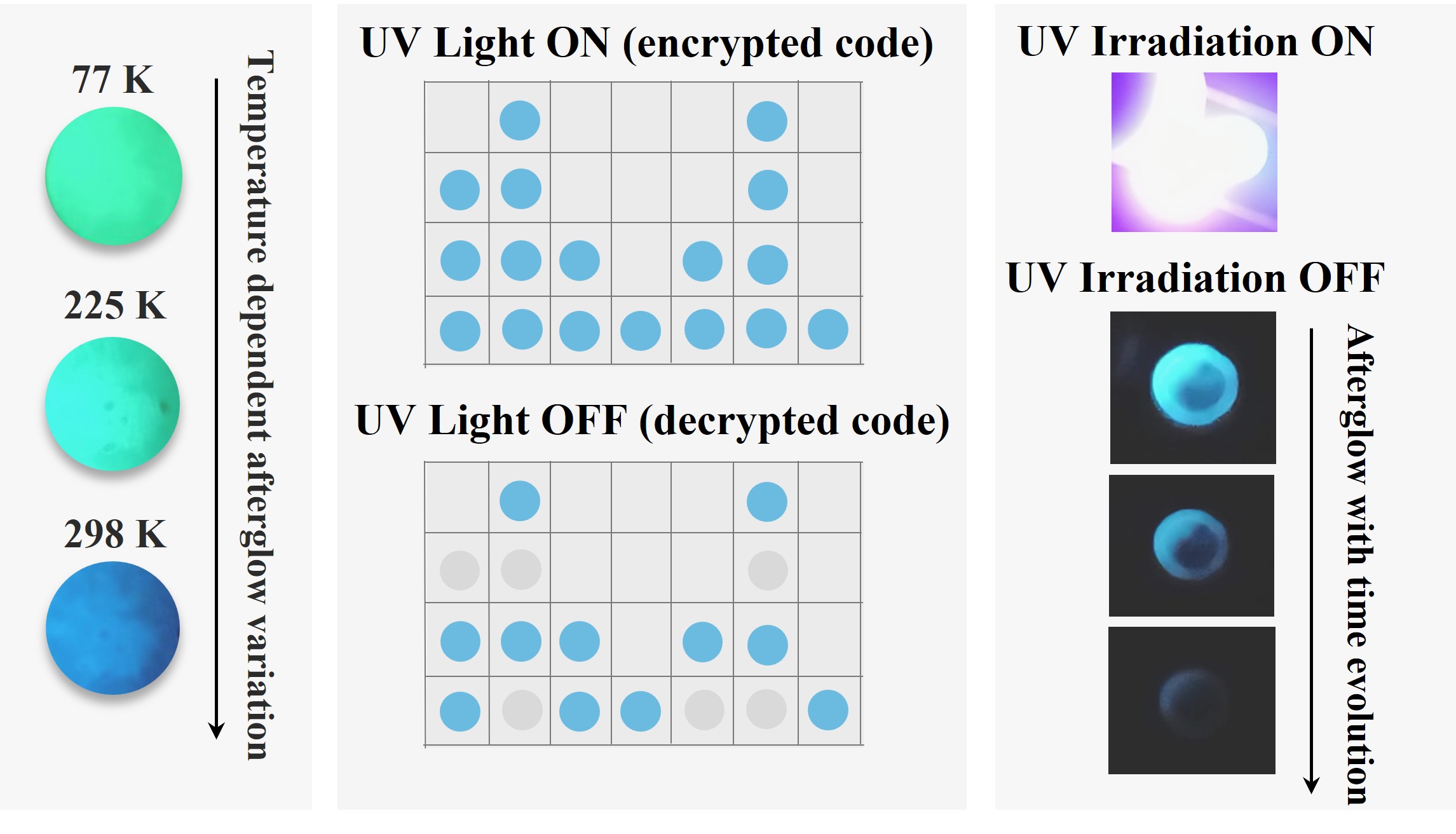 Left: Temperature-dependent change in the afterglow colour under oxygen-free conditions. Middle: Encryption and decryption of protected data for anti-counterfeiting applications under oxygen-free conditions. Right: Afterglow experiment under ambient conditions.